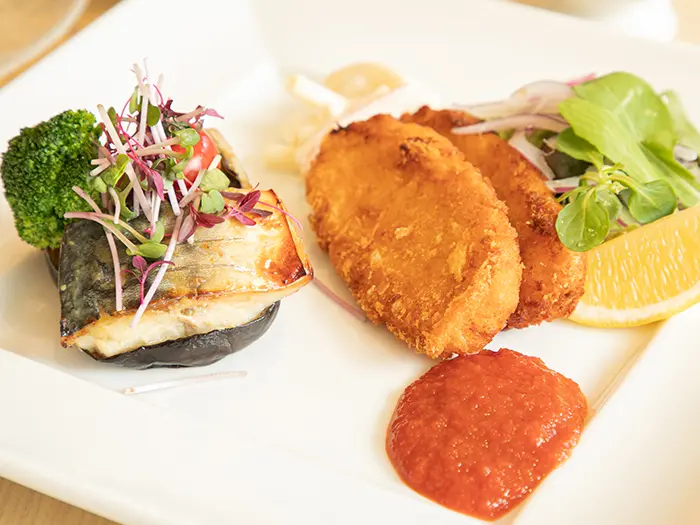 佐倉みそで香ばしく焼き上げたサバと、トロリと濃厚な自家製カニクリームコロッケの贅沢な組み合わせ。
