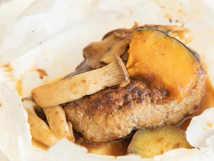 オーストラリア産牛肉のひき肉に、秋を代表するきのこをたっぷりと包み込み、香り豊かに焼き上げました。