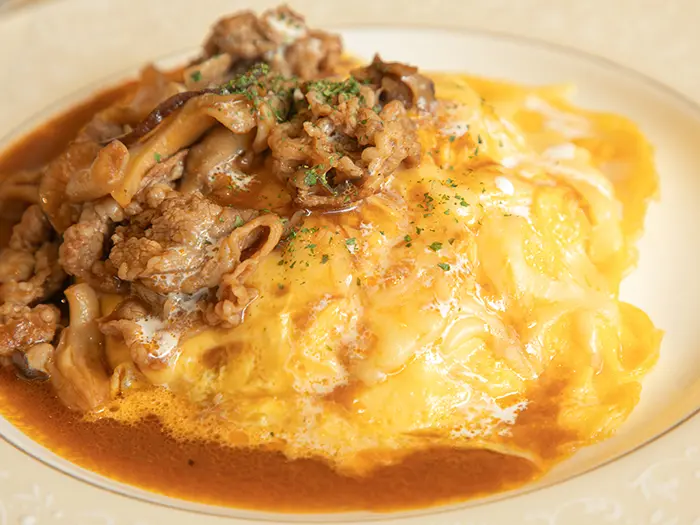 やわらかな牛肉ときのこを合わせ、ふわふわ&とろーり食感の卵で包んだチーズオムライス。