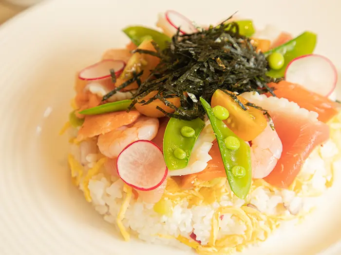 サーモン・いか・海老・まぐろを彩りよく盛りつけた、フレンチシェフならではの洋風ちらし寿司。