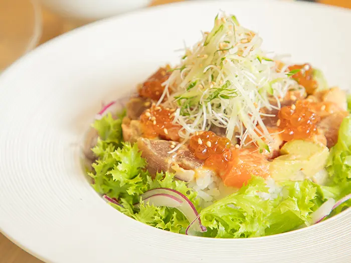 新鮮なまぐろとサーモン、クリーミーなアボカドに彩り豊かな野菜をたっぷりのせた、ヘルシーで満足感のあるボウル。