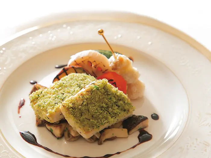 メカジキは香草とこんにく、オリーブオイルでじっくりとマリネし、しっとり焼き上げたうえで、香草パン粉をまとわせて仕上げております。